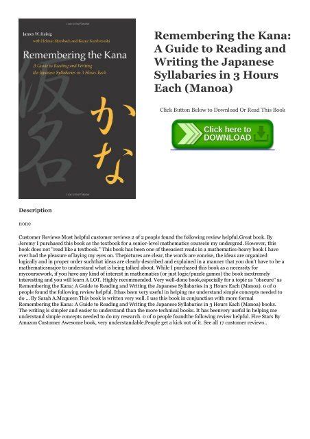 0 Response to "Read Online Remembering the Kana: A Guide to Reading and Writing the Japanese Syllabaries in 3 Hours Each Paperback "